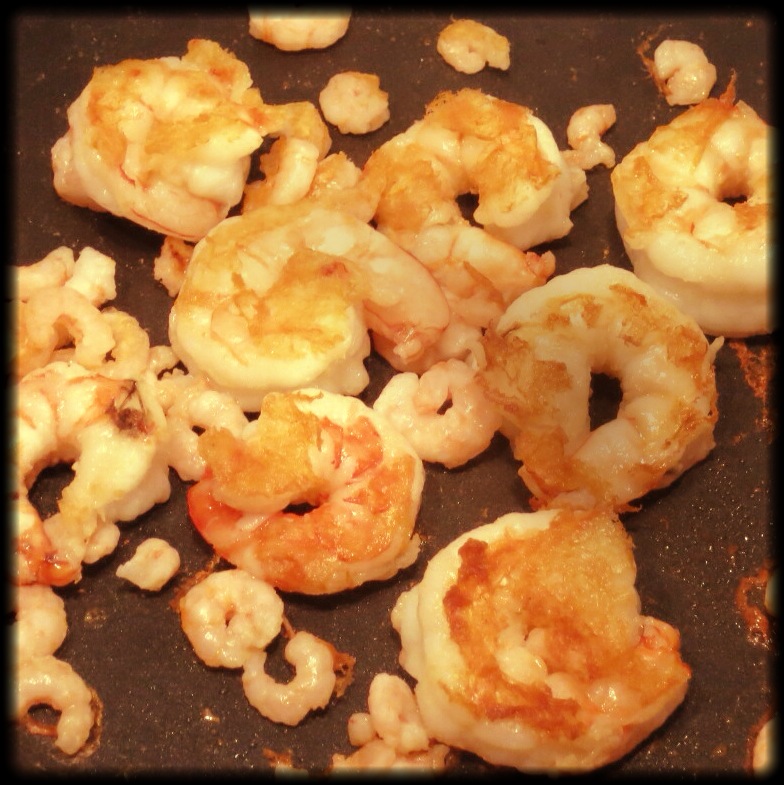 Wenn der Reis fast fertig ist, bratet ihr die Garnelen in einer Pfanne mit etwas Butter an. Nachdem ihr sie einmal gewendet habt, gebt ihr den sehr klein geschnittenen Knoblauch hinzu und salzt sowie pfeffert die Garnelen.
