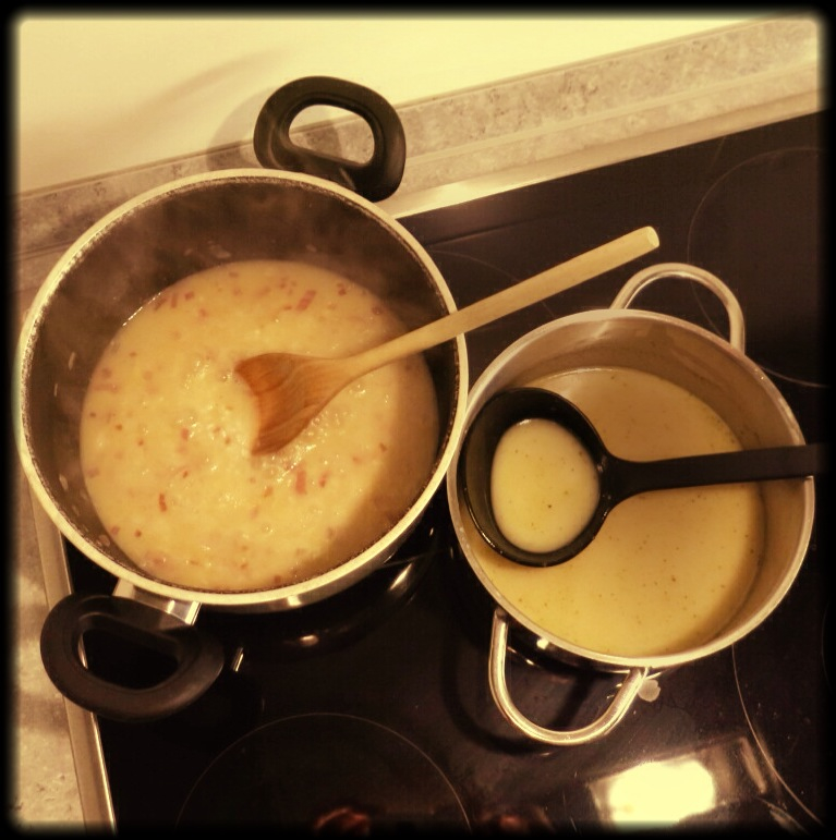 Zuerst setzt ihr die Gemüsebrühe in einem kleinen Topf auf und gebt die Kokosmilch hinzu.