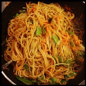 Währenddessen reibt ihr die rohe Möhre und stellt sie beiseite. In einer kleinen Schüssel oder einer bauchigen Tasse rührt ihr die Soße an: Dafür gebt ihr die Erdnussbutter – etwa zwei sehr, sehr stark gehäufte Teelöffel; so viel wie drauf geht – und die Sojasoße in die Schüssel. Fügt zwei Schöpfkellen des noch warmen Nudelwassers zu. Durch die Wärme lässt sich die Erdnussbutter geschmeidig mit der restlichen Flüssigkeit zu einer Soße verrühren.