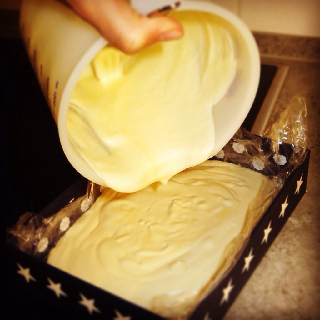 Nun legt ihr eine rechteckige Form mit Klarsichtfolie aus, sodass sie an den Seiten übersteht. Zum Beispiel eine kleine Auflaufform bietet sich an. Ich habe einen festen Kartondeckel genommen. Dort füllt ihr die Sahnemasse hinein und stellt sie für mehrere Stunden ins Eisfach.