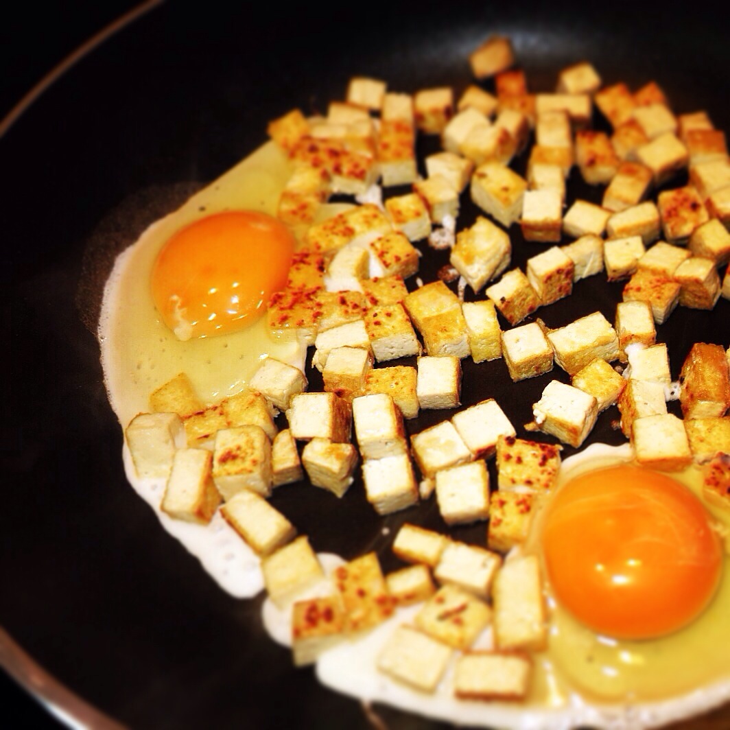 Danach ist der Tofu dran. Ihr schneidet ihn auf einem großen Brett in Würfel und stäubt anschließend das Mehl darüber. Ihr vermischt beides, bis das Mehl vollständig an den Würfeln haftet. In einer Pfanne mit dem restlichen Öl bratet ihr sie für etwa 5 Minuten bei gelegentlichem Rühren an, sodass sie leicht braun werden. Nach drei Minuten der Zeit dreht ihr den Herd auf die Hälfte der Hitze hinunter und fügt den geschälten und klein gehackten Knoblauch hinzu. Er sollte leicht angedünstet werden.