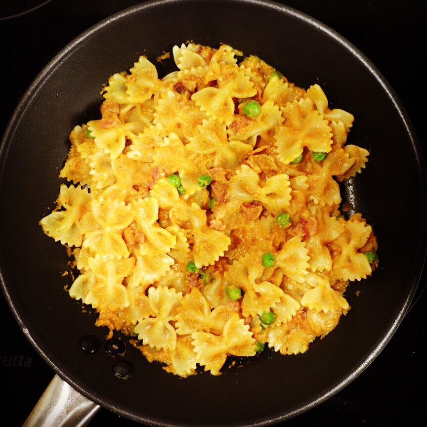 Orange statt rot: Pürierte Karotten bilden eine hervorragende Basis für Pastasoße, habe ich entdeckt. Es müssen nicht immer Tomaten sein. Der gebratene Bacon gibt den Möhren eine tolle herzhafte Note. Und wer glaubt, das Gericht sei ja gar nicht typisch italienisch, dem kann ich nur sagen: Das Rezept kommt quasi direkt aus Italien – ich habe es selbst übersetzt und nach meinem Geschmack (leicht) abgewandelt.