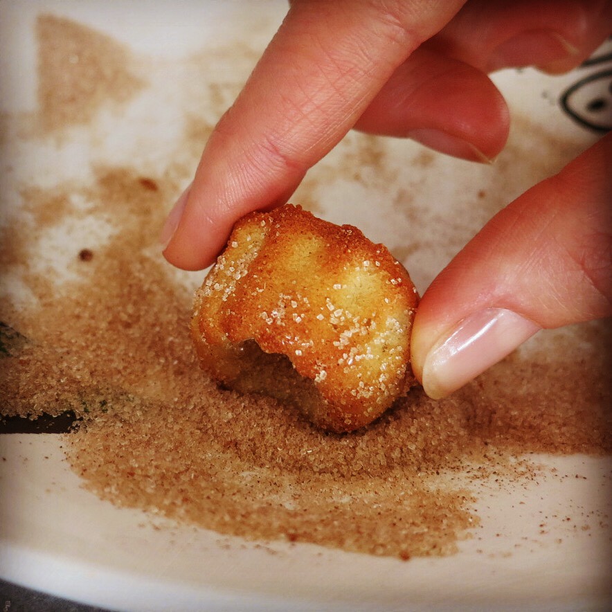 Wenn die Backzeit um ist, lasst ihr sie für wenige Minuten abkühlen. Dann nehmt ihr ein Törtchen nach dem anderen aus der Form und wälzt sie sofort in der Zucker-Zimt-Mischung. Fertig!