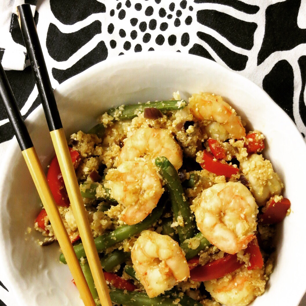 Heute gibt es gaaanz viel leckeres knackiges Gemüse mit Garnelen. Sonst nichts. Ja, ihr habt richtig gelesen. Dieses Garnelen-Curry serviere ich nicht mit Reis, sondern mit einer fast kohlehydratfreien Alternative: mit zerkleinerten Blumenkohl-Röschen – oder auch Blumenkohl-Reis. Probiert es doch einfach mal aus!