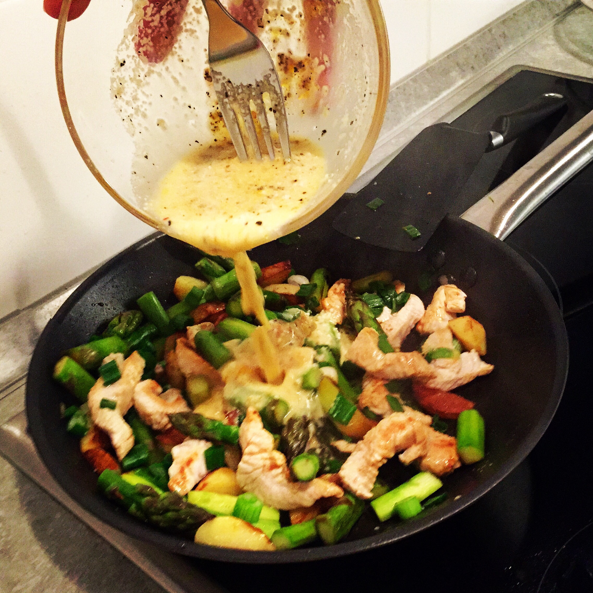 In einer kleinen Schüssel verrührt ihr die beiden Eigelbe, die Rama Cremefine, die Milch und den Parmesan. Gießt die Flüssigkeit in die Pfanne. Rührt so lange gut um, bis die Flüssigkeit zu einer cremigen Soße geworden ist. Verteilt die Spargel-Hähnchen-Pfanne auf zwei Teller. Guten Appetit!