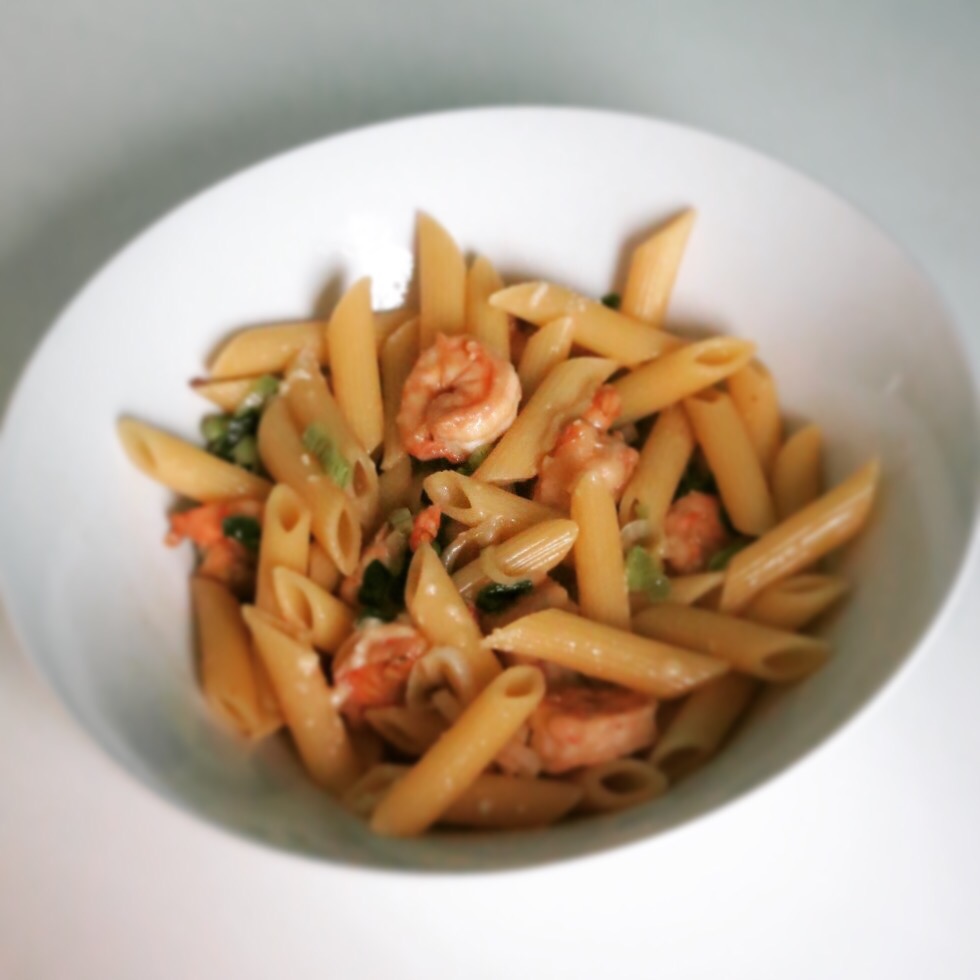Wenn die Zeit um ist, setzt ihr Salzwasser für die Pasta auf und kocht diese nach Packungsanleitung. Schneidet die Frühlingszwiebeln in Ringe. Während die Nudeln kochen, erhitzt ihr eine Pfanne auf dem Herd (ca. 2/3 der Hitze) und gebt den kompletten Tüteninhalt hinein. Bratet die Garnelen von beiden Seiten je circa zwei Minuten an – überkocht sie aber nicht (ich lese währenddessen den Knoblauch heraus, weil mir die Stückchen zu viel des Guten sind). Nach der Hälfte der Zeit gebt ihr die Frühlingszwiebeln hinzu und lasst sie kurz mitdünsten. Anschließend gebt ihr die abgegossene Pasta in die Pfanne und mischt sie gut mit den Garnelen. Serviert die Garnelen-Pfanne auf zwei Tellern und bestreut sie mit je einem Esslöffel geriebenem Parmesan. Wenn ihr schnell umrührt, solang die Nudeln noch heiß sind, schmilzt der Parmesan leicht – lecker!