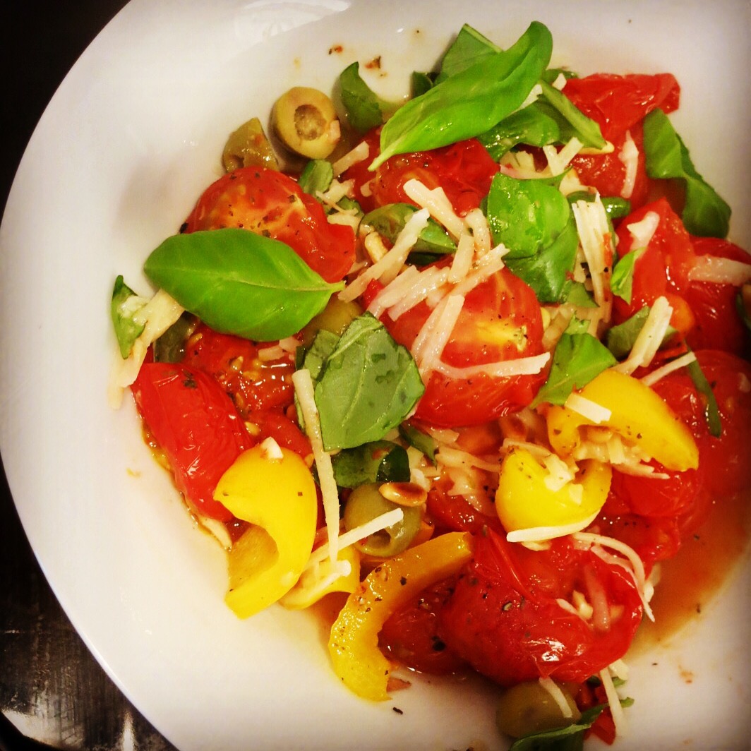 Gebt die Tomatenhälften und Paprikastückchen vorsichtig mit zwei Gabeln und ohne den ausgetretenen Saft in eine Schüssel. Die Knoblauchscheiben lese ich raus, aber das ist Geschmacksache. Verrührt das Gemüse vorsichtig mit dem Parmesan, den Pinienkernen, den Oliven und dem Basilikum. Richtet den Salat gemeinsam mit dem Fischfilet an.