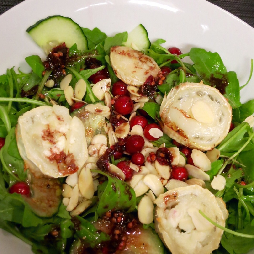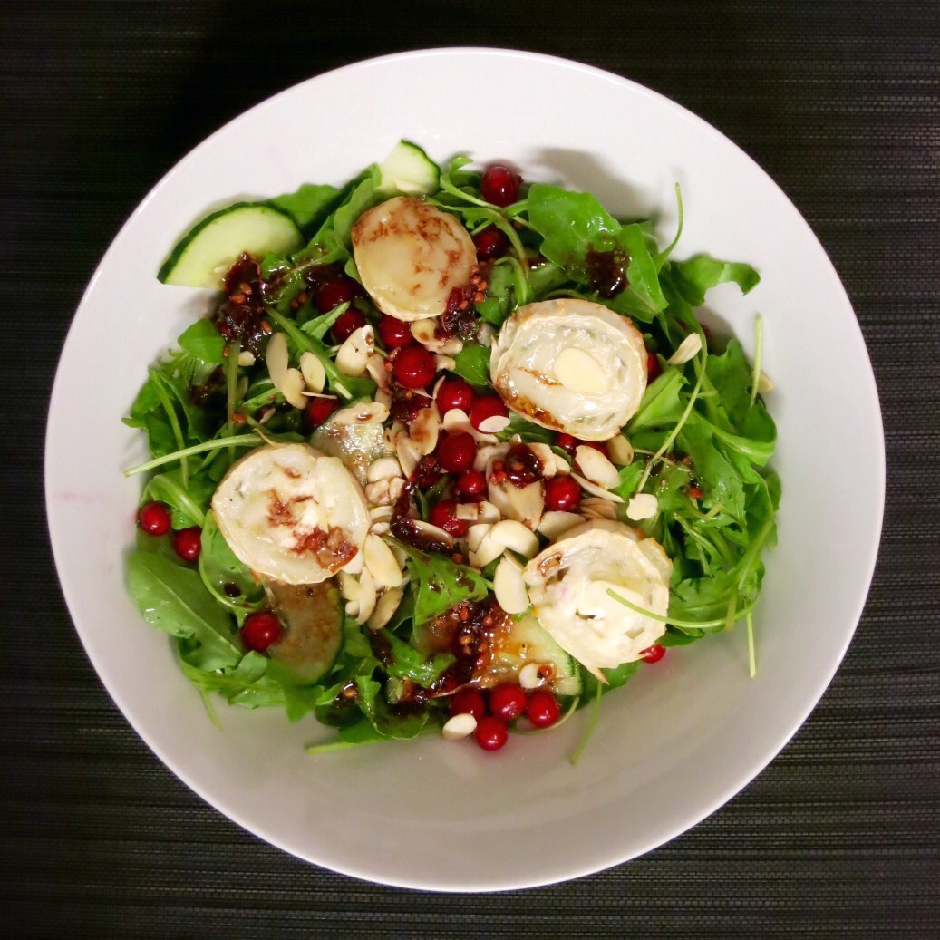 Verrührt den Salat mit den Mandeln sowie der Salatsoße und gebt zum Schluss die Ziegenkäsescheiben, die inzwischen fertig sein sollten, oben drauf. Natürlich könnt ihr als Beilage Baguette dazu reichen.