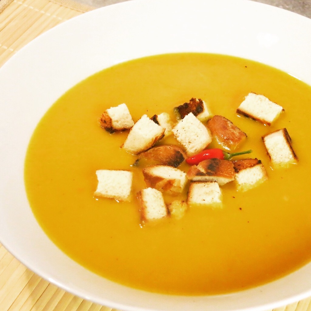 Kocht sie noch einmal auf und schmeckt sie mit Salz und Pfeffer ab. Wenn ihr mögt, könnt ihr geröstete Brotwürfel oder Kürbiskerne dazu reichen.