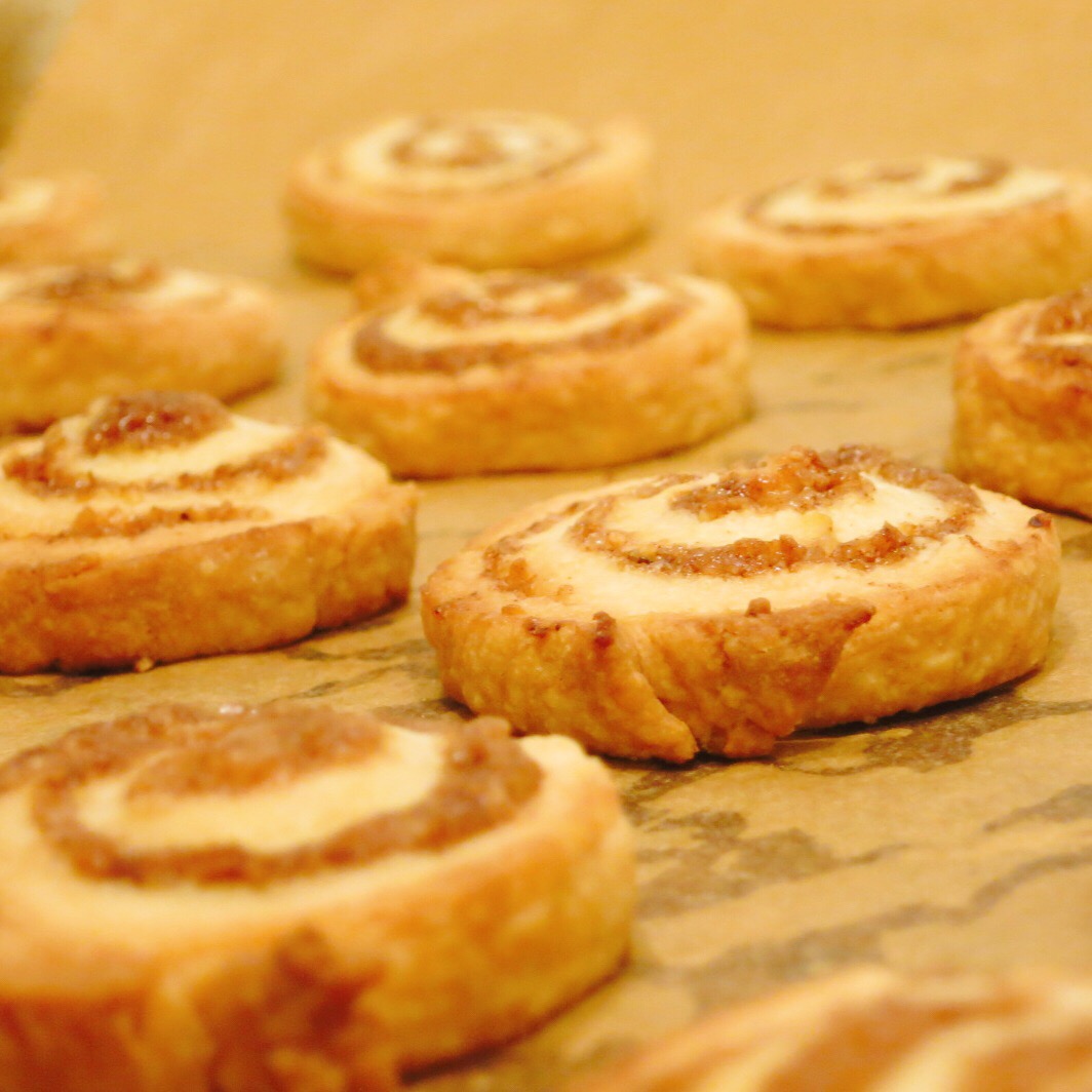 Danach halbiert ihr den Teig und rollt die erste Hälfte mit einem Nudelholz zu einem circa 2 Millimeter dicken Rechteck. Verfahrt mit der zweiten Hälfte genauso. Für die Füllung verrührt ihr sämtliche der restlichen Zutaten. Streicht die Zimtmasse gleichmäßig auf die beiden Teigrechtecke. Nur an je einer langen Seite spart ihr einen Zentimeter aus. Rollt beide Rechtecke von der jeweils anderen langen Seite her auf. Die Rollen stellt ihr noch einmal für 20 Minuten kühl. Heizt den Backofen auf 200 Grad vor.