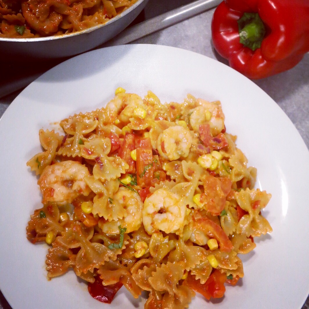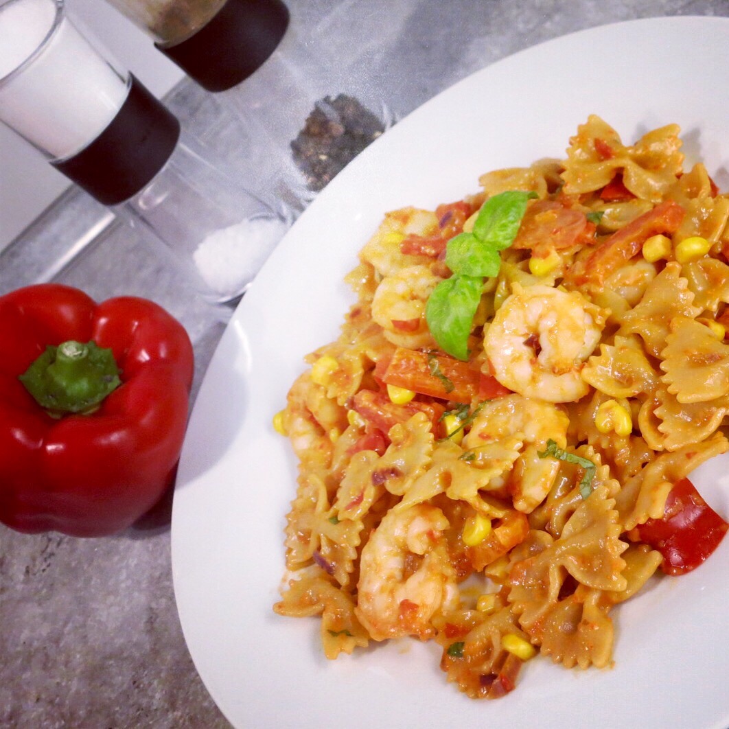 PDF-Druckversion und Rezept-Download: Vollkornpasta mit Garnelen in Paprikasoße