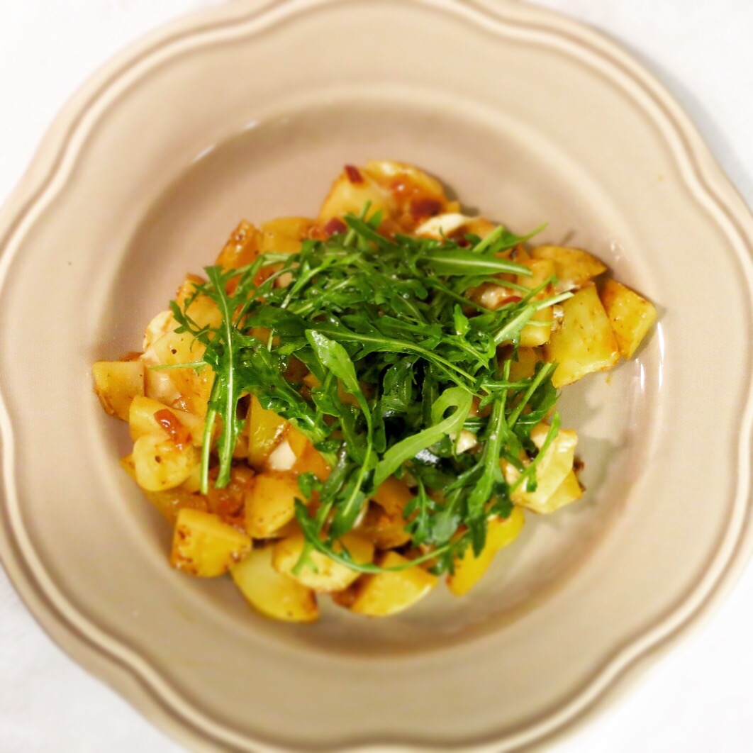 Schaltet den Herd aus. Dann rührt ihr zwei großzügige TL rotes Pesto in die Kartoffeln und hebt den Mozzarella unter. Lasst ihn mit geschlossenem Deckel für wenige Minuten schmelzen. Verteilt die Kartoffelpfanne auf zwei Tellern und garniert sie mit dem Rucola.