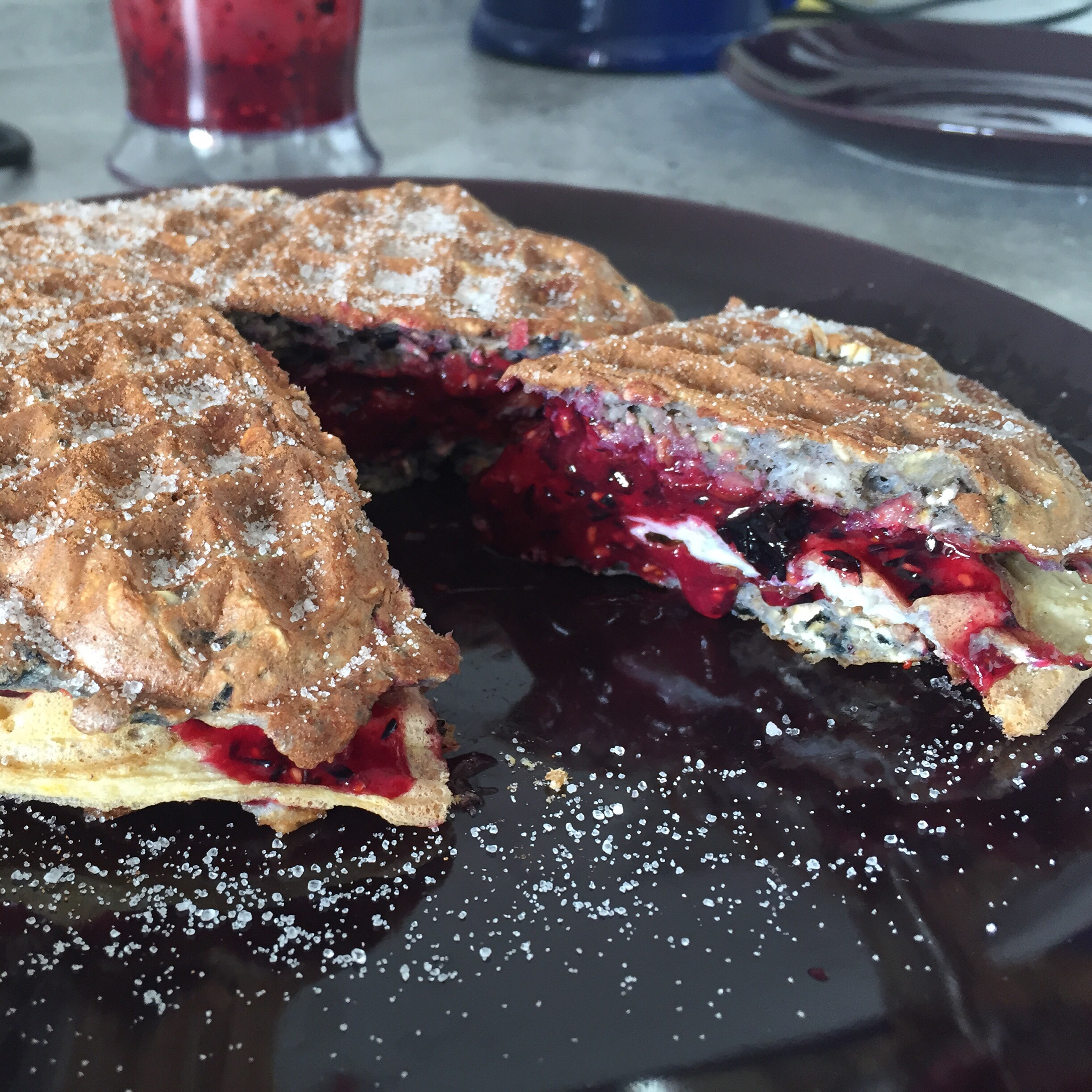 Dann schichtet ihr das Waffelsandwich aufeinander: Haferflocken-Waffel – eine Schicht Beerenpüree – Eierwaffel – zweite Schicht Beerenpüree – zweite Haferflocken-Waffel. Wenn ihr möchtet, könnt ihr die Waffel noch mit etwas Zimt und Zucker bestreuen. Lasst sie euch schmecken.