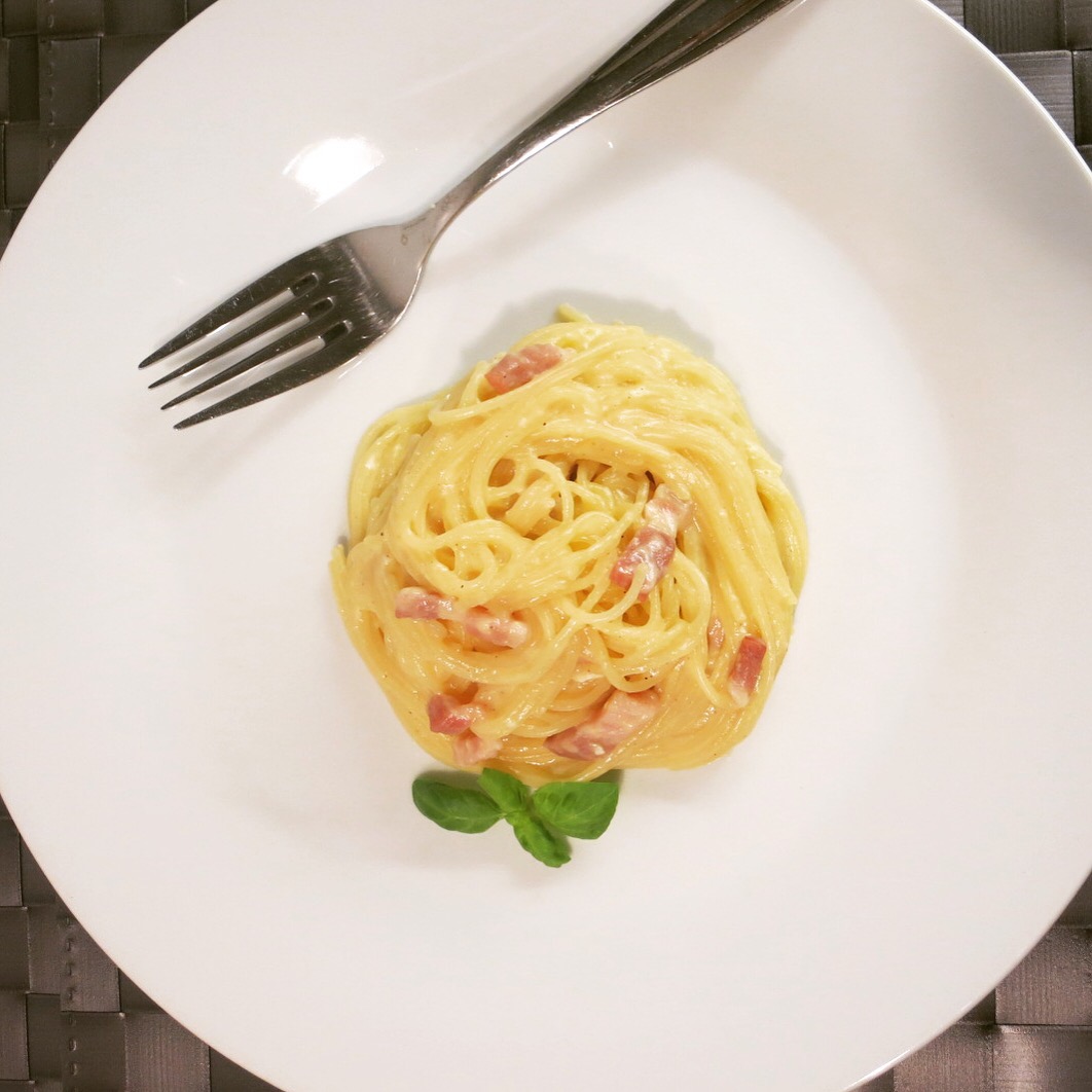 Wie man richtige italienische Spaghetti Carbonara kocht, habe ich bei meinem Auslandssemester in Venedig gelernt. Auch wenn sich das Gerücht in Deutschland hartnäckig hält; Carbonara ist kein Sahnesoße! Sahne kommt gar nicht hinein, wurde ich damals belehrt. Statt dessen besteht die Soße aus dem Fett des Specks, den Eiern, Milch oder Wasser und, wenn man möchte, Öl (ich lasse es weg). Deshalb ist Carbonara auch gar nicht die Kalorienbombe, als die sie verschrien ist. Aber lecker ist sie – und das beste Beispiel dafür, wie man aus einer Handvoll einfachen Zutaten ein klassisches, aber unwiderstehliches Gericht zaubern kann. Meine absolute Lieblings-Pasta – buonissimo!