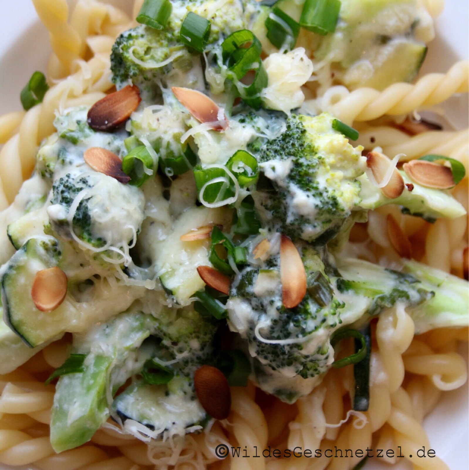 Reibt den Käse. Verrührt ihn in einer Schüssel mit dem Frischkäse, der Milch und einem Schluck Wasser. Rührt die Mischung unter das Gemüse und kocht alles kurz auf. Gebt auch die Mandeln hinzu. Vermischt nun die Nudeln mit der Gemüsesoße und serviert sie auf zwei Tellern.