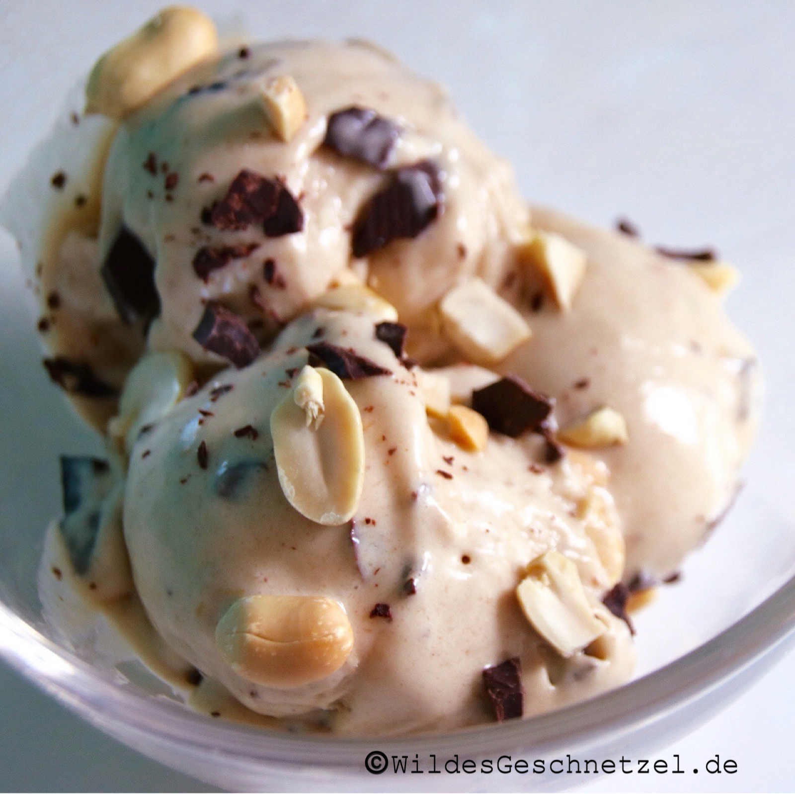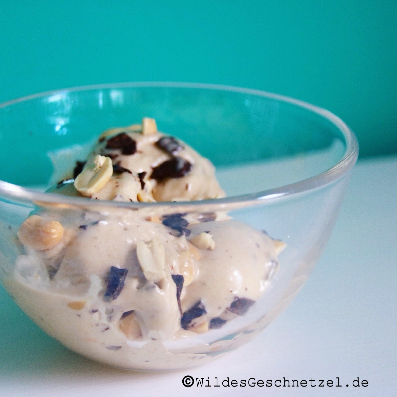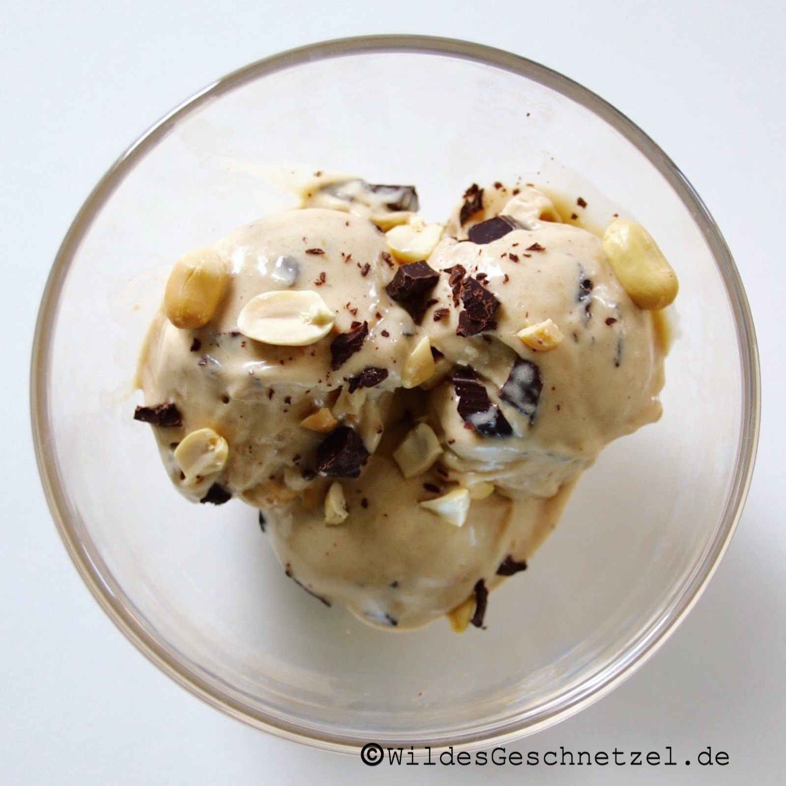 Rührt die Erdnüsse und die Schokolade unter. Serviert das Eis sofort oder stellt es nochmal kurz ins Kühlfach. Guten Appetit!