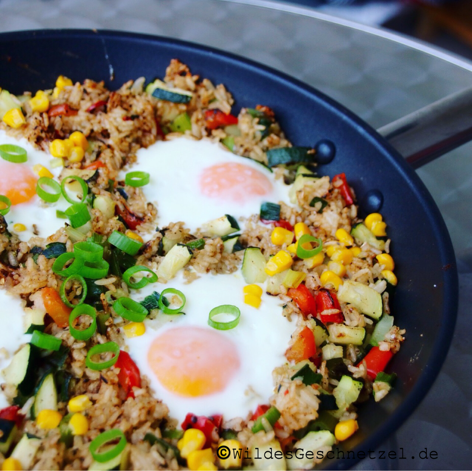 Ich finde, das Auge isst immer mit. Aber vor allem mag ich es bunt. Deswegen liebe ich diese Reispfanne schon allein aus visuellen Gründen. Erinnert euch der Farbmix nicht auch an Frühling? Deswegen gibt es die bunte Reispfanne mit Ei bei mir demnächst öfters an besonders grauen Herbstabenden.