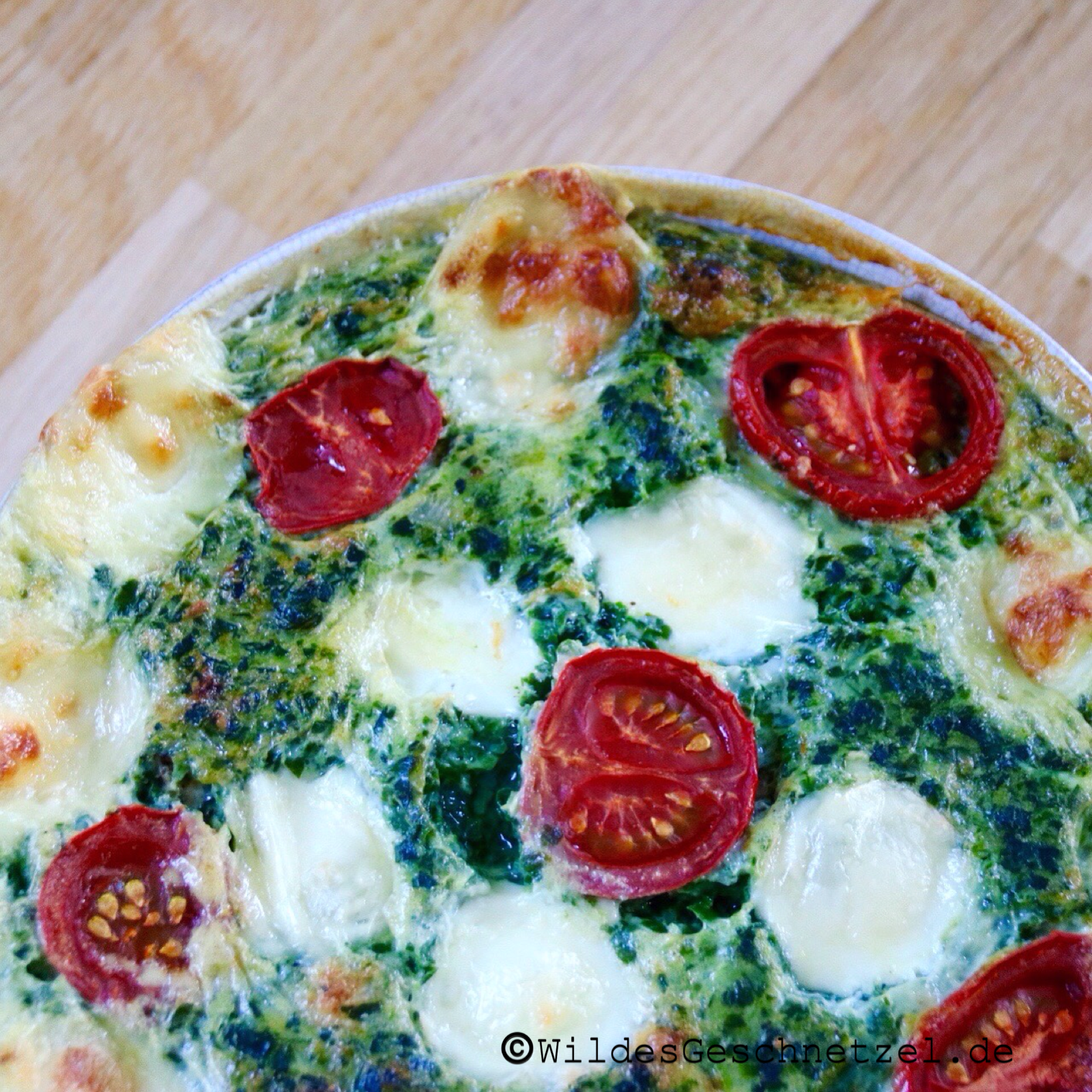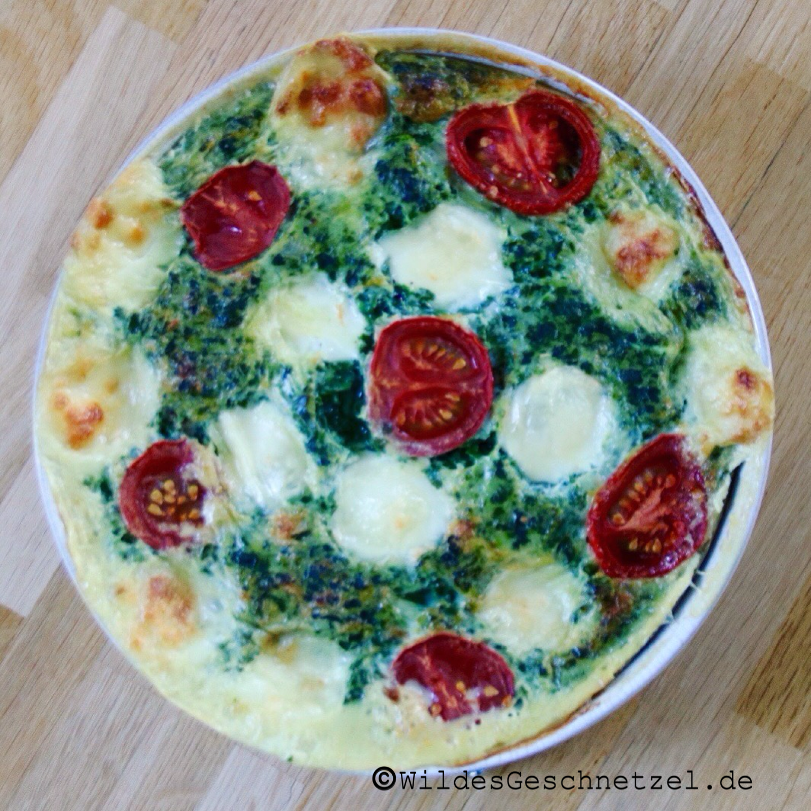 Füllt die Masse in eine mittelgroße Auflaufform oder verteilt sie auf zwei kleine Formen. Verteilt die restlichen kleinen Mozzarellakugeln und die halbierten Tomaten gleichmäßig auf dem Auflauf und schiebt ihn dann für 30 Minuten in den Ofen.