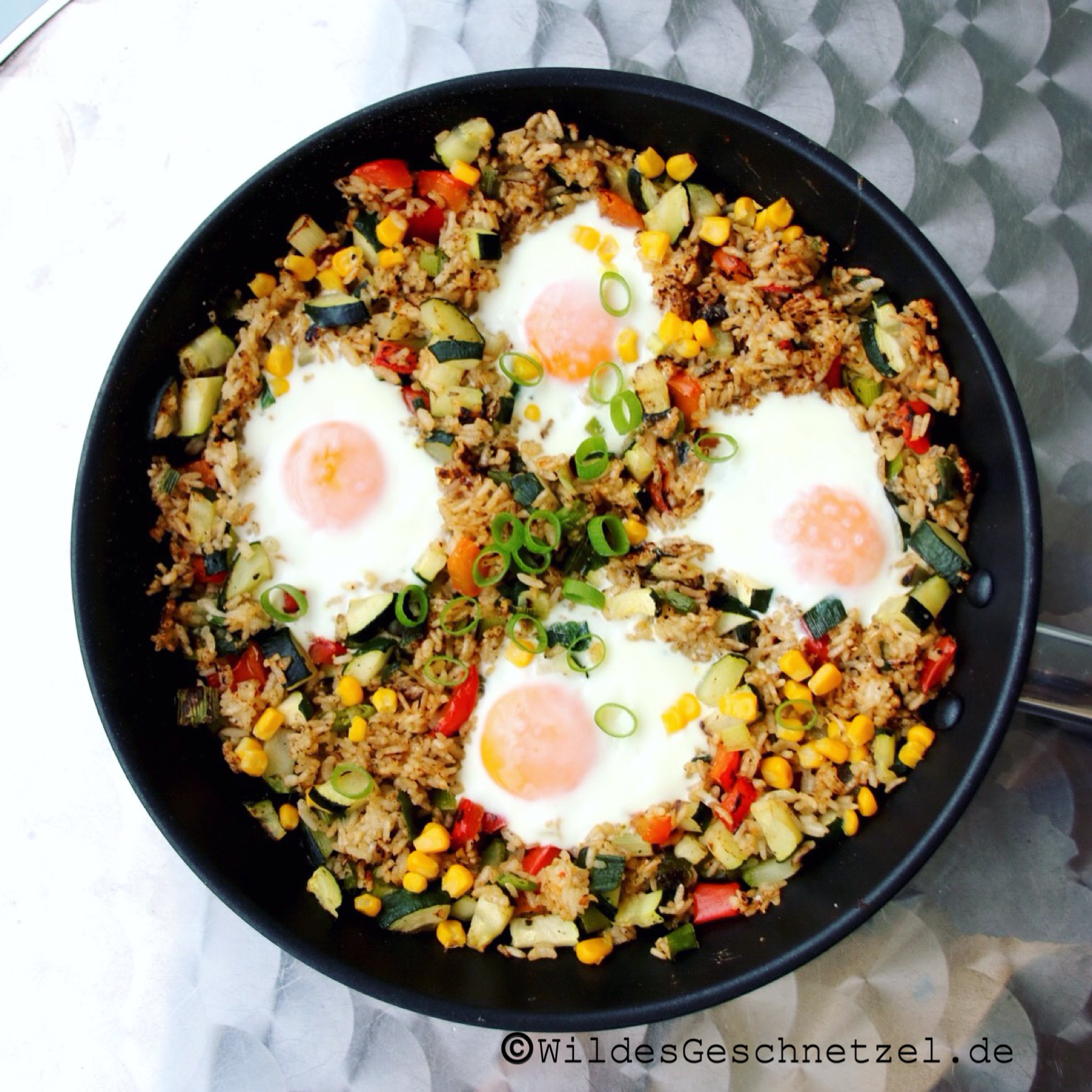 Ausgewogen – das ist wohl die richtige Beschreibung für die bunte Reispfanne. Der Reis ist eine tolle Energiequelle und macht euch ordentlich satt. Die roten Paprika versorgen euch mit viel Vitamin C, aber auch den Mineralien Kalium, Magnesium, Zink und Kalzium. Die Zucchini liefert Beta-Carotin, eine Vorstufe von Vitamin A, sowie Eisen. Der Mais punktet mit sättigenden Ballaststoffen und lebensnotwendigen Proteinen. Wertvolle Proteine stecken auch in den Eiern.