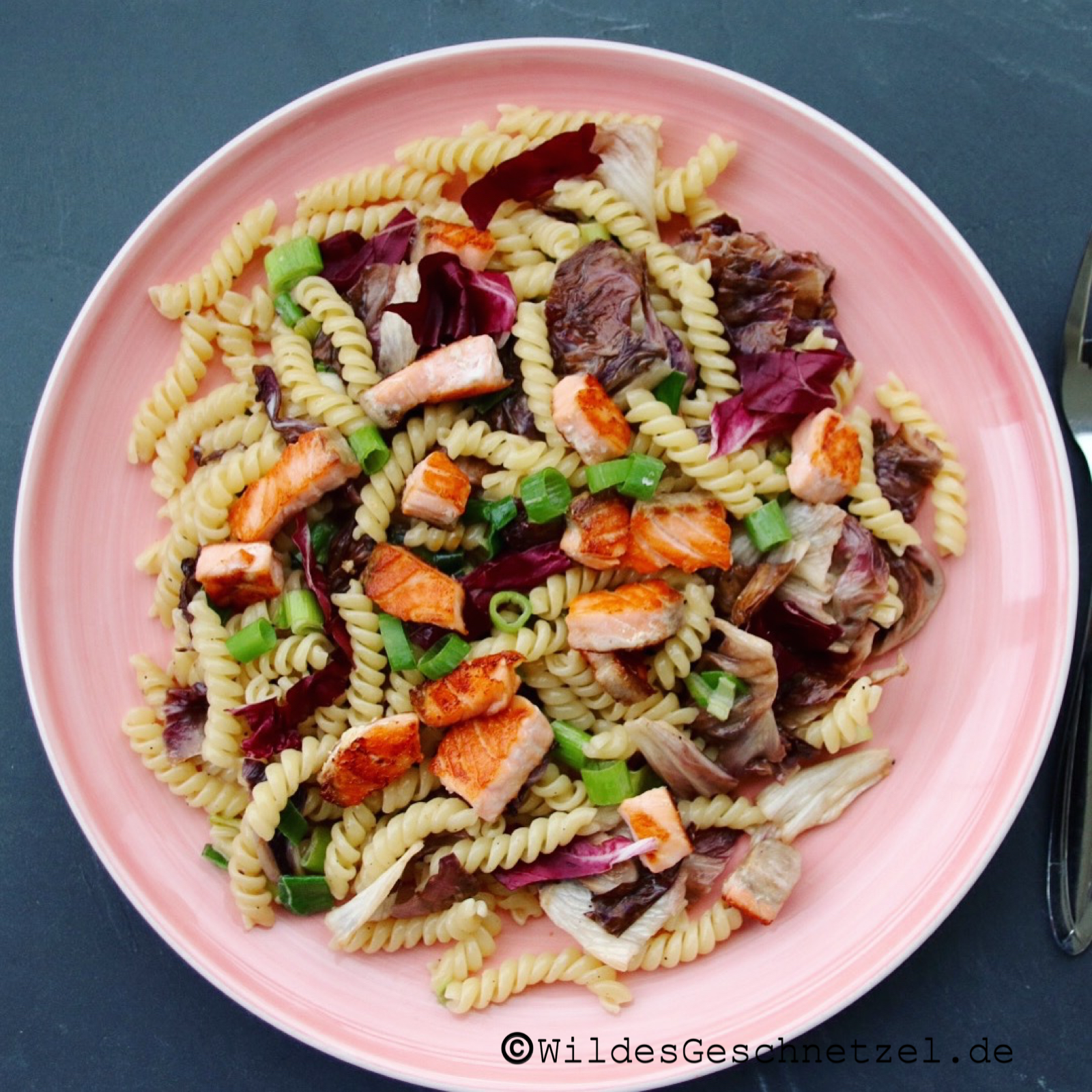 Kocht die Nudeln in Salzwasser nach Packungsanleitung bissfest. Scheidet den Lachs in Würfel und die Frühlingszwiebeln in Ringe. Entfernt den Strunk des Radicchios, vereinzelt die Blätter und schneidet sie in mundgerechte Stücke. Bratet die Lachswürfel in einer Pfanne von beiden Seiten knusprig an. Salzt den Lachs und stellt ihn auf einem Teller beiseite.