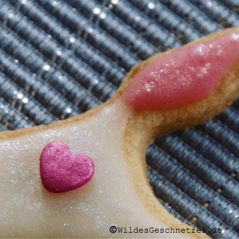 Auf das Horn und den Po der Einhörner habe ich je ein wenig Glitzerstaub verteilt. Mit einem Punkt Zuckerguss habe ich Herzchen auf die Hinterteile geklebt. Mähne und Schweif habe ich auf zwei Weisen aufgetragen: