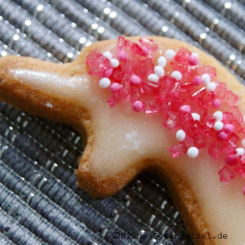 2. Ich habe mit weißem Zuckerguss Mähne und Schweif vorgezeichnet und diese dann mit Zuckerstreuseln bestreut, sodass sie kleben bleiben.