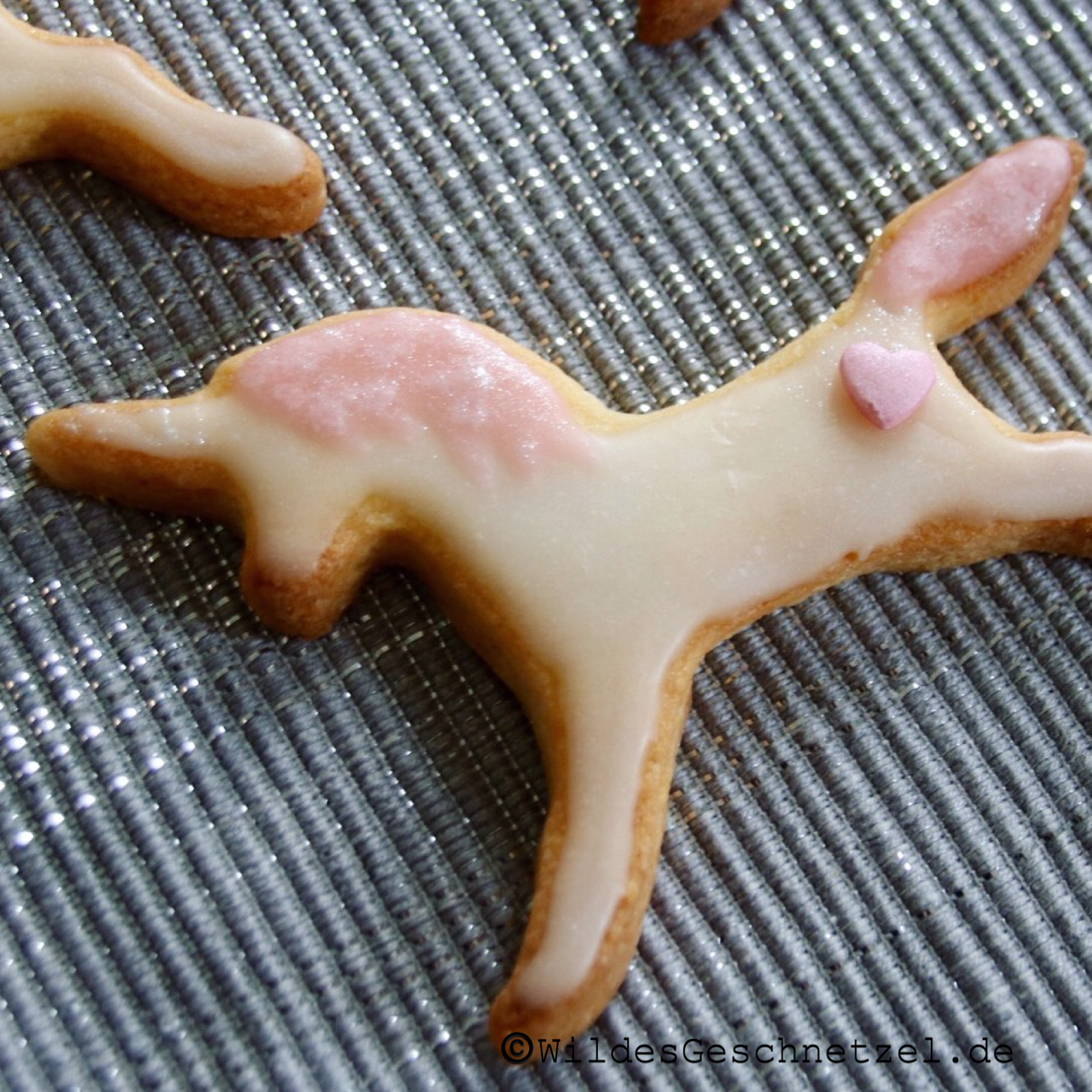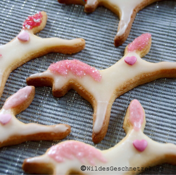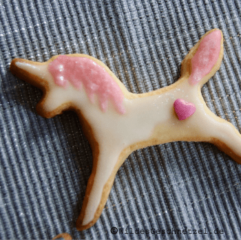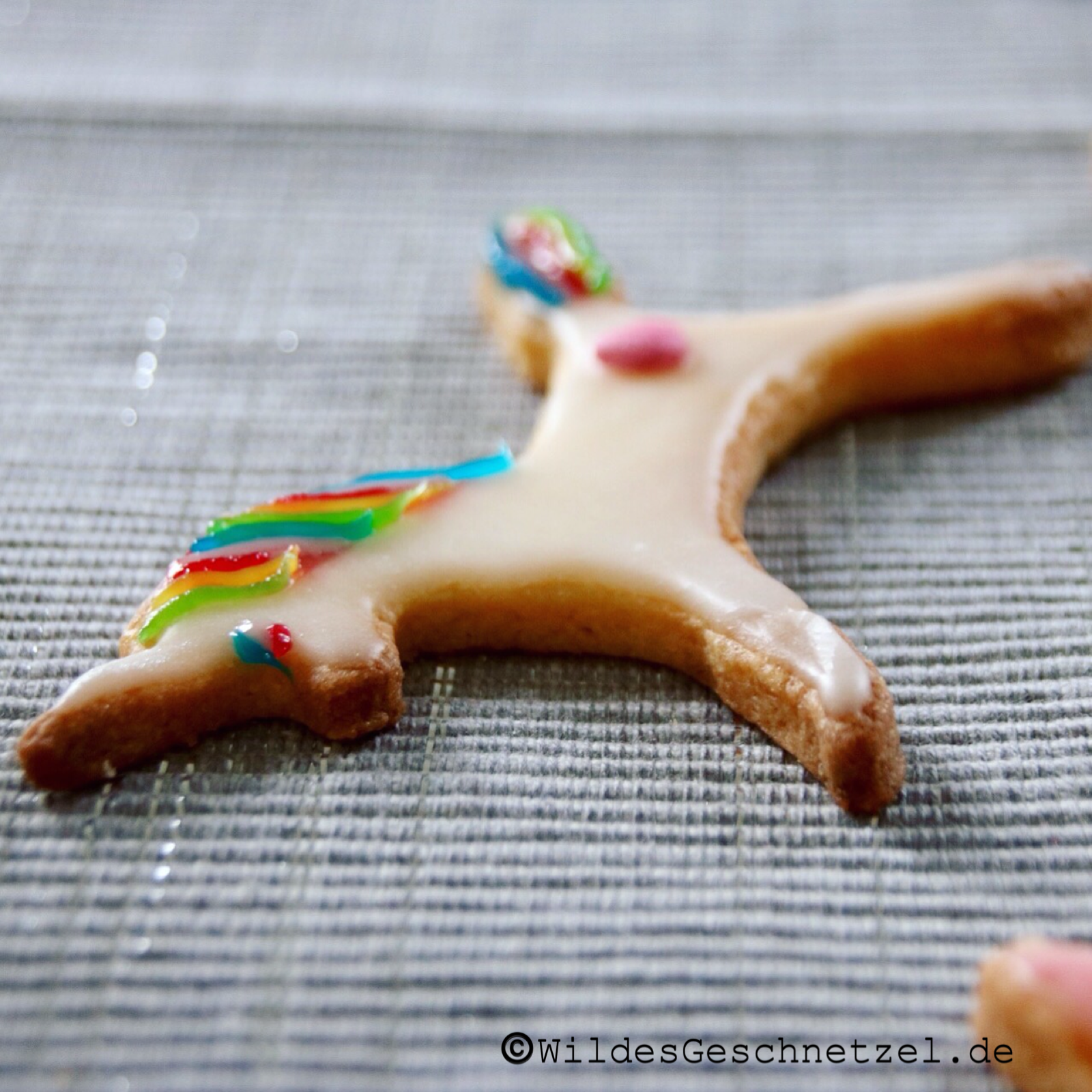 Bestäubt eure Arbeitsfläche mit Mehl und rollt den Teig darauf aus. Stecht daraus die Einhörner aus. Die Förmchen dafür gibt’s zum Beispiel hier (kein Werbelink). Positioniert sie vorsichtig auf einem mit Backpapier ausgelegten Backblech. Backt sie ca. 10 Minuten bei 180 Grad. Sie sollten nicht zu braun werden.