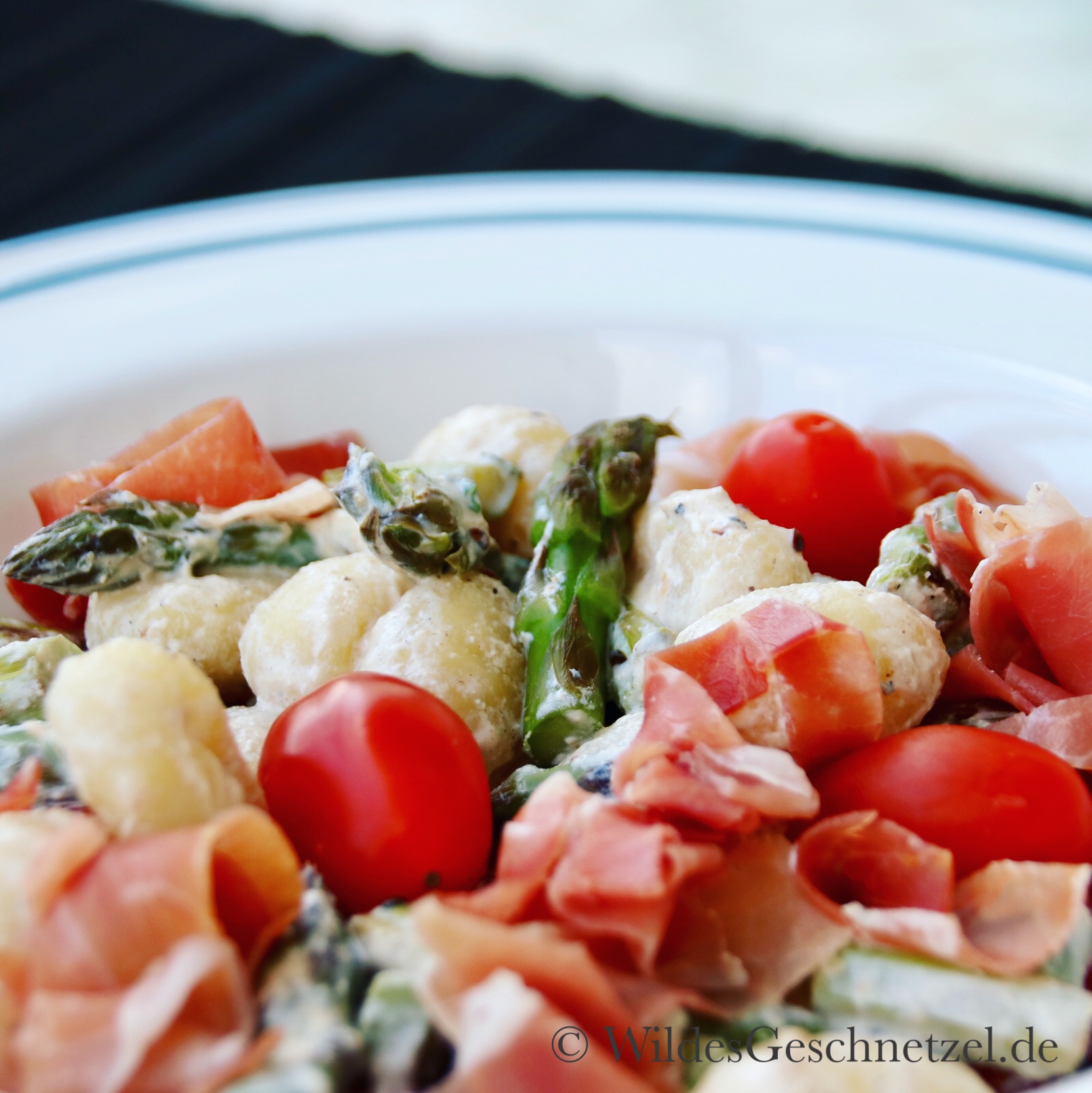 PDF-Druckversion und Rezept-Download: Spargel-Gnocchi mit Schinken-Parmesansoße