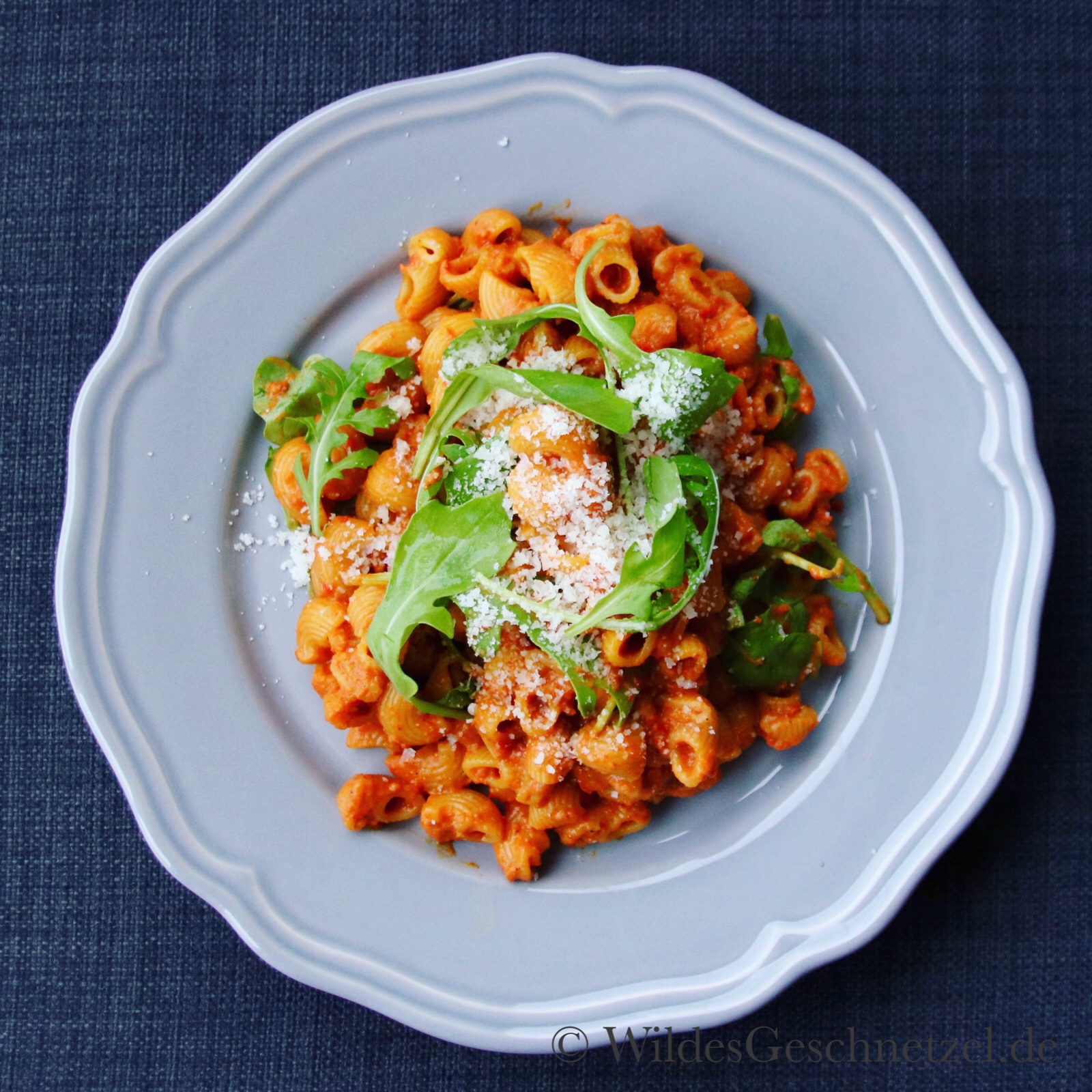 Dann rührt ihr die Pasta und den Rucola unter die Soße, verteilt sie auf zwei Teller und bestreut sie mit Parmesan.