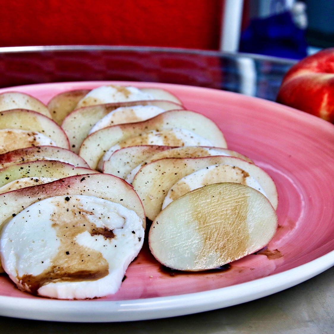 Legt die Pfirsich- und Mozzarellascheiben abwechselnd wie einen Fächer auf einen Teller. Träufelt etwas Essig darüber. Salzt und pfeffert die Käse und Obst. Dazu passt Baguette oder Ciabatta. Lasst es euch schmecken.