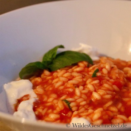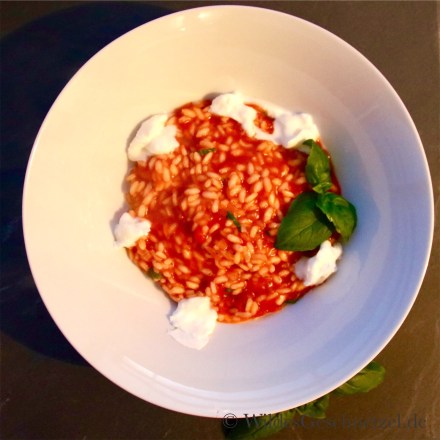Ich weiß gar nicht, warum ich nicht früher auf die Idee gekommen bin, dieses Tomaten-Risotto zu kochen. Denn es ist einfach der Hammer. Liebe auf den ersten Bissen. Deshalb koche ich immer gleich das doppelte Rezept. So habe ich noch mehrere Portionen fürs Mittagessen an der Arbeit. Am besten schmeckt es natürlich mit Büffelmozzarella, aber der aus Kuhmilch geht natürlich auch.