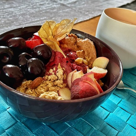 Schneide das Obst, pro Schale etwa eine gute Handvoll, in Stücke. Garniere die eisige Beerenmasse mit dem Obst, dem Granola und der Erdnussbutter sowie den Nüssen. Für ein optischen i-Tüpfelchen garniere ich die Bowl am liebsten mit einer Physalis.